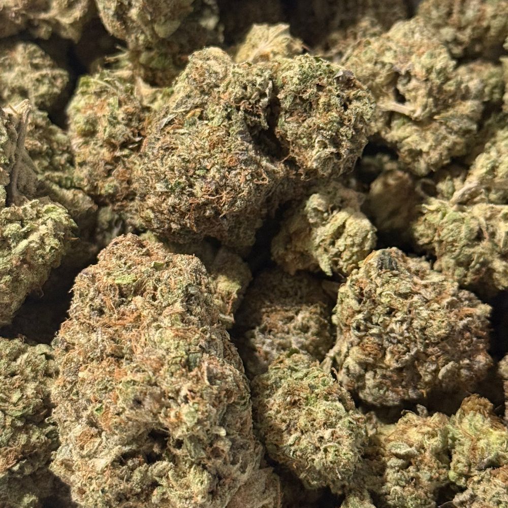 Rockstar Tuna—also known as Tuna Rockstar or Tuna Star—is a heavily indica-dominant hybrid (90% indica/10% sativa) created by crossing Tuna Kush with Rockstar. It inherits its bold aroma from its Tuna Kush parent, delivering an intensely pungent scent marked by notes of rotting fish, spicy grapes, and herbs. The flavor is milder, featuring earthy skunk tones accented by sweet grapes and spicy herbal undertones. The effects are long-lasting and distinctive, beginning with a rush of lifted, unfocused mental bliss that gradually gives way to deep physical relaxation without heavy sedation, often accompanied by intense hunger. With an average THC content of 19–26%, Rockstar Tuna is commonly used to help manage chronic stress, appetite loss or nausea, chronic pain, muscle cramps or spasms, and inflammation. The buds are rounded and minty green, highlighted by vibrant orange hairs and a thick coating of frosty amber trichomes.